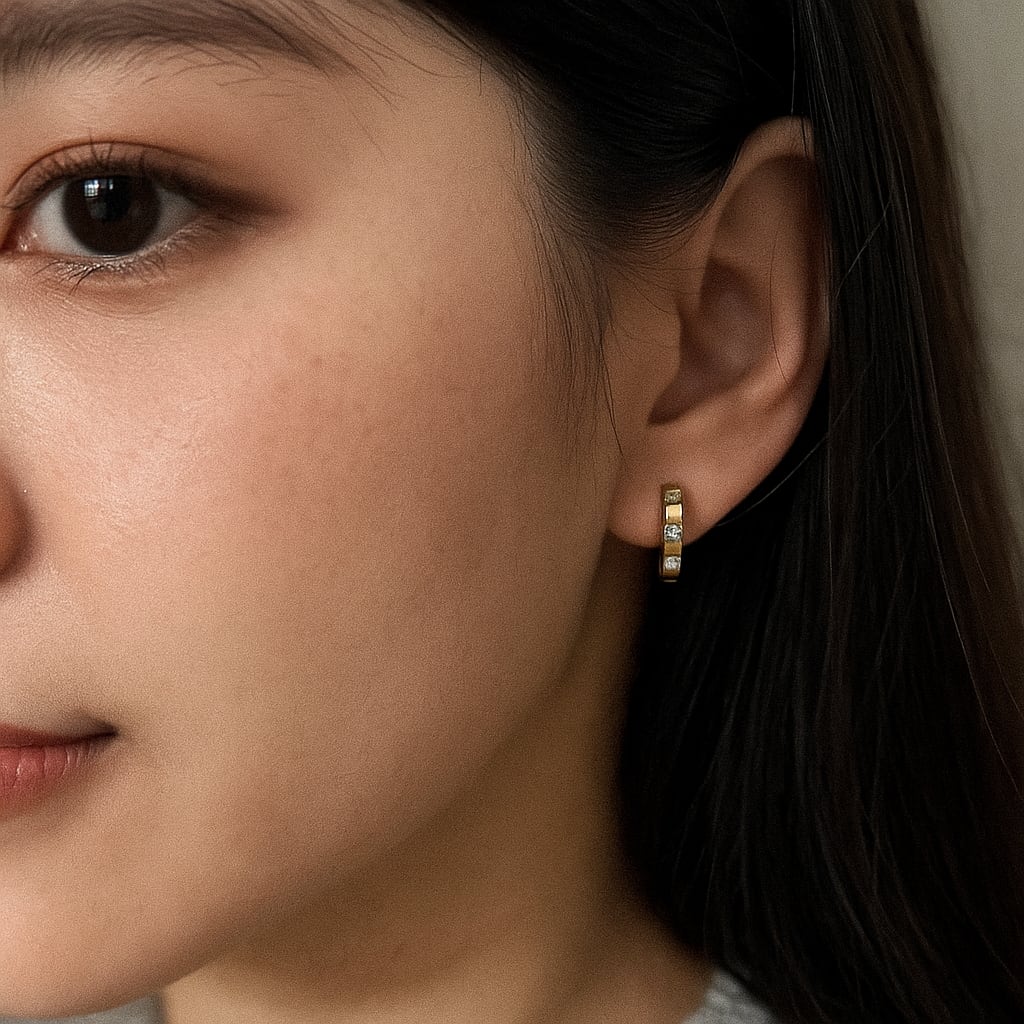 約12mmのサイズの小ぶりの 5つ縦に並んだジルコニアがきらりと光る フープイヤリングになります。 石のキラキラ感も上品で、 シンプルながらも存在感のあるアイテムです。 小さめのデザインでどんなコーディネートにも合わせやすく、 付けっぱなしでも快適なつけ心地が魅力です。 ■カラー ゴールド シルバー ■材质■ ジルコニア 金属部分:メッキ(ニッケルフリー) ※金属アレルギー等肌に合わない方はご注意ください ※表面に細かい傷がある場合がございますが不良品ではございませんのでご了承下さい --------------------------------------------------------------------- ▼・・・・・・・・・・▼ 1点でも送料無料! 今だけの特別キャンペーン❤ 1点からでも送料無料です! ▲・・・・・・・・・・▲ ◆独自の構造で、やさしくフィット◆ hugmiのイヤリングは、市販ではあまり見かけない独自の構造。 やわらかくしなる調整可能な金属ワイヤーと、 シリコンのやさしい摩擦力によって、耳たぶにふんわりフィットします。 きつい・ゆるいと感じたときは、お好みにあわせてご自身で幅の調整が可能です。 「挟む」のではなく「支える」構造だから、 耳たぶの厚みに自然になじみ、 長時間つけても痛くなりにくく、外れにくいのが特長です。 ***詳しい装着方法・調節方法をご案内しております*** https://hugmi.base.ec/p/00001 --------------------------------------------------------------------- ◆ こんな方におすすめ◆ ・耳たぶが厚く、イヤリングで痛くなりやすい方 ・金属アレルギーでおしゃれをあきらめていた方 ・市販のイヤリングは金具が目立つのが気になる方 ・耳たぶが薄く、すぐ外れてしまうのが不安な方 ◎耳たぶ以外にも軟骨部分などお好みの場所にお使いいただけます ◎ピアスホールが無くてもOK!挟むだけのの簡単装着! ◎耳たぶの裏側に当たるシリコンゴムはとても小さいので 悪目立ちせずスッキリお使いいただけます。 ◎小ぶりサイズなのでマスクやマフラーなどに引っかかりにくいのも --------------------------------------------------------------------- ◆ 保証・修理について ◆ 90日以内は 修理無料 お買い上け日から3ヶ月以内の修理は、自損以外の理由に限 り無償で行わせていただきます。 保証期間を過ぎた場合は有償となりますのでご了承ください。 修理ご依頼の際はhugmi公式LINEよりご連絡ください。